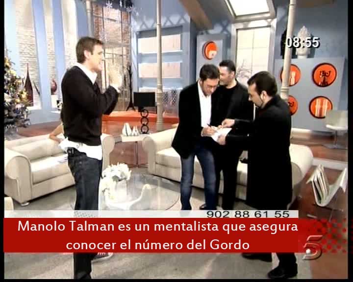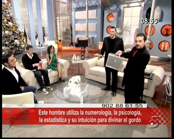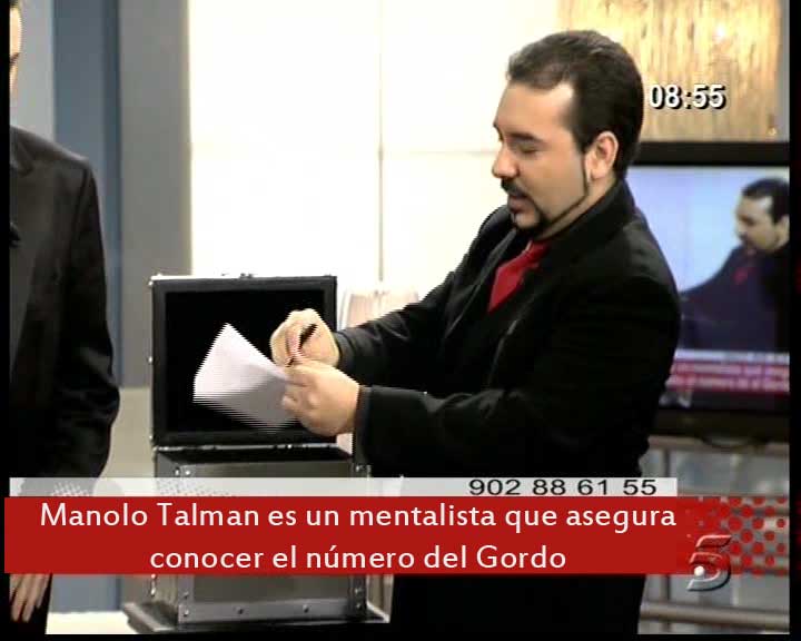 15 de diciembre de 2008 Sobre la mesa un reto imposible propuesto por la productora Cuarzo TV para realizar en directo el dia 22 de diciembre el el programa de Ana Rosa Quintana la prediccion de loteria mas imposible nunca antes jamas realizada. El reto comenzaba a las 8:45, dando a firmar la prediccióna Maxim Huerta, la cual fue guardada en un sobre que también firmaría Oscar Martínez, con el fin de comprobar que ni el sobre, ni la predicción, pudiera ser cambiado por otro a lo largo de todo el sorteo. Este sobre, fue guardado y custodiado en una caja de seguridad la cual, estuvo en todo momento a la vista del público y quedando la llave en poder de Oscar Martínez durante el trascurso de todo el sorteo. A las 11:59h la suerte destina al número 32365 como el Gordo de la Navidad, escasos momentos después, en riguroso directo, Oscar Martínez procedía a abrir la caja de seguridad y extraer el mismo el sobre que custodiaba la predicción. Ante la sorpresa de todo el mundo, ahí se encontraba escrito en una pancarta el numero 32365 y la hora aproximada en la que iba a salir (entre las 11:55 y las 12:00h). Como prueba irrefrutable que ningun otro mentalista habia hecho antes, no conformes con la prediccion, para garantizar la veracidad de la prediccion se llevo a plato un décimo como comprobante de la apuesta. |